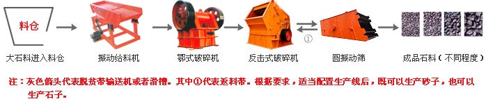 大塊石料經(jīng)料倉由振動給料機均勻地送進鄂式破碎機進行粗碎,粗碎后的石料由皮帶輸送機送到反擊式破碎機進行進一步破碎;細碎后的石料由皮帶輸送機送進振動篩進行篩分,篩分出幾種不同規(guī)格的石子,滿足粒度要求的石子由成品皮帶輸送機送往成品料堆;不滿足粒度要求的石子由皮帶輸送機返料送到反擊式破碎機進行再次破碎,形成閉路多次循環(huán)。